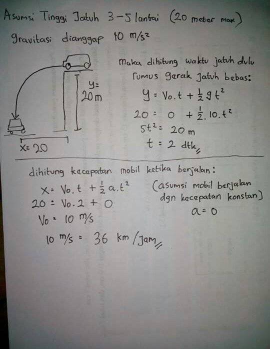 Dari mal hingga ke lokasi kejadian, jaraknya sekitar 20m. Kalo begitu, berapa kecepatan mobil dari lantai tiga saat jatuh hingga menimpa Innova? Ada yang bisa jawab?