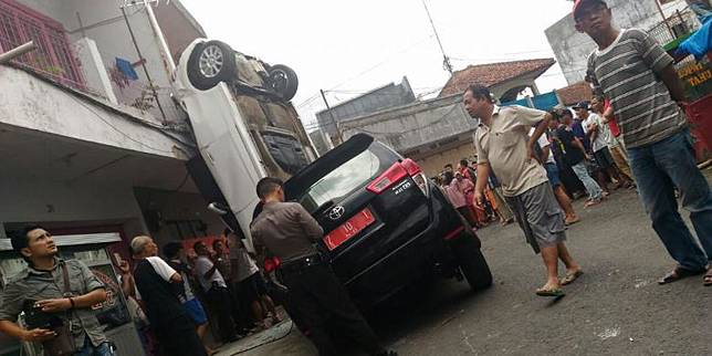 Mobilnya menimpa sebuah mobil Toyota Kijang Innova yang tengah parkir di bawah sehingga korban bersama anaknya menderita luka benturan ringan saat menghantam mobil di bawahnya.